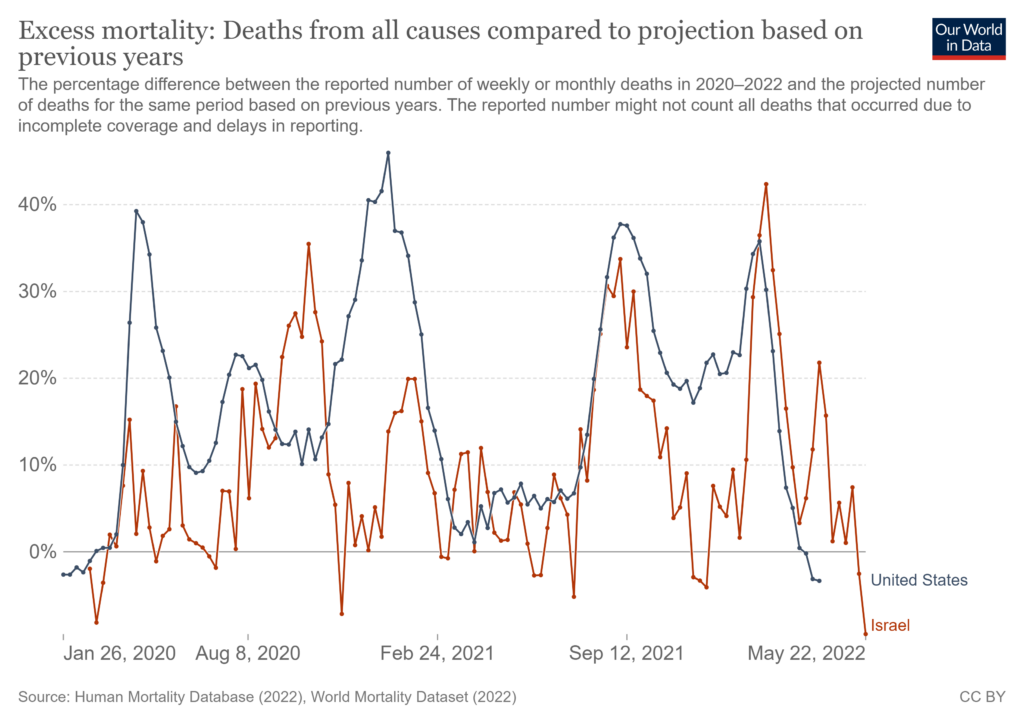 Israel also hit a new record peak in excess deaths, while the U.S. had large post-vaccine peaks including one during Omicron.