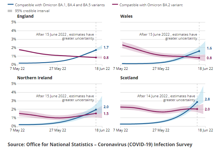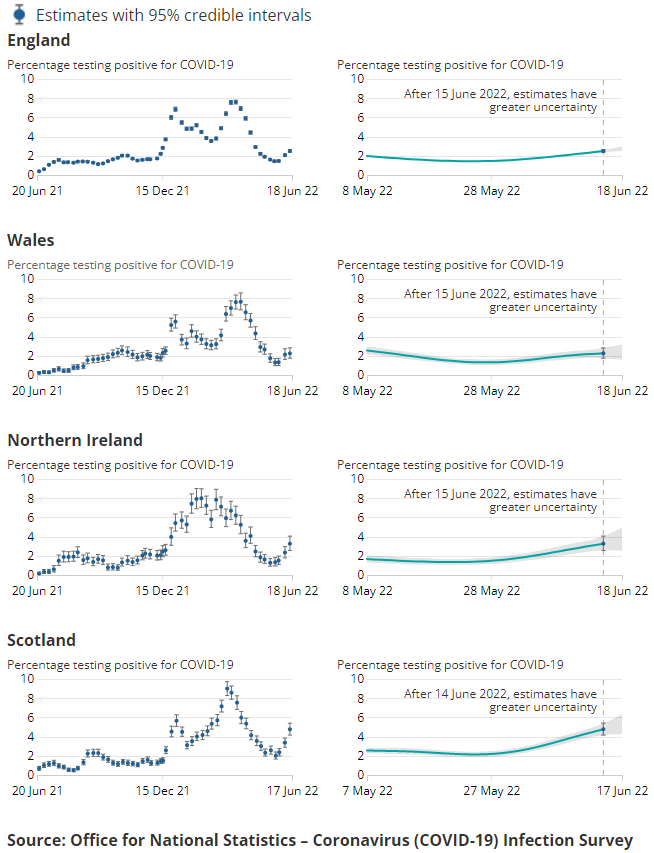 The latest ONS infection survey figures, released Friday, show that the BA.4 and BA.5 wave appears to be slowing down in England and Wales (though not in Scotland) but has not yet (as of week ending June 18th) peaked.