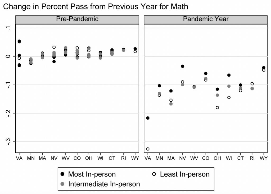 Turning to the chart on the right (for the pandemic year), you can see that – within each state – the black dots are higher than the grey or clear dots. This indicates that school districts which relied most on in-person learning saw the smallest declines in pass rates. (Those that relied least on in-person learning generally saw the greatest declines).