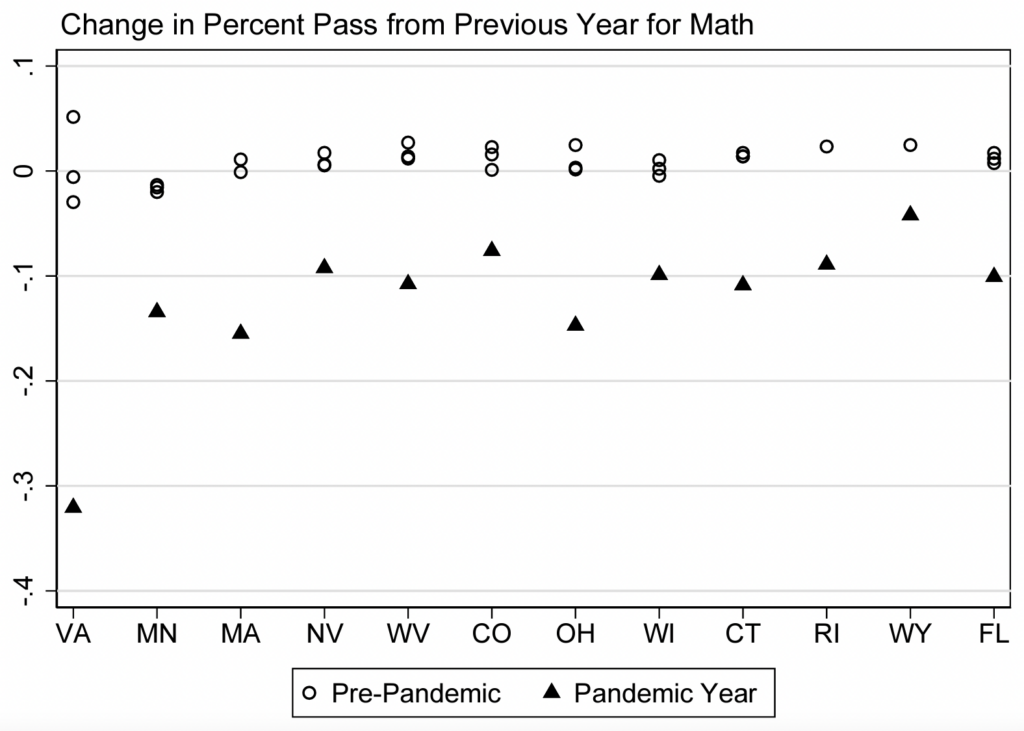 For example, school districts in Virginia that relied most on in-person learning saw pass rates decline by ‘only’ around 22 percentage points, whereas those that relied least on in-person learning saw them decline by more than 32 percentage points.