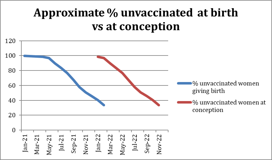 We can surmise from this that the percentage of unvaccinated women conceiving in 2021 would be similar to this group and thus be a suitable proxy, as expectant mothers and those aspiring to conceive should have a similar risk appetite for taking the vaccines. Thus for example, those giving birth in January 2022 would have an unvaccinated representation at conception similar to women giving birth in April 2021. Here are the two scenarios displayed on the same graph with the 9 month lag between them: