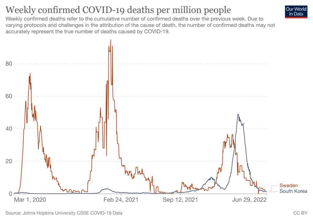“Vincent Rajkumar (a professor at the Mayo Clinic) proclaimed, “South Korea followed the textbook principles of epidemiology. Kept deaths 40 times lower all the way till 75% of population fully vaccinated. This is success.”