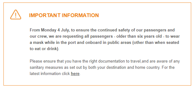 Stop Press: A reader got in touch to say that Brittany Ferries has informed him that masks are now “requested” once again onboard (see below). One wonders how firm the “request” will be.