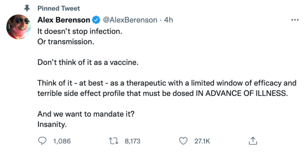 Twitter suspended Berenson last year after flagging one of his tweets that questioned the effectiveness of Covid vaccines and suggested that they’re “at best… a therapeutic with a limited window of efficacy and terrible side effect profile that must be dosed IN ADVANCE OF ILLNESS.”