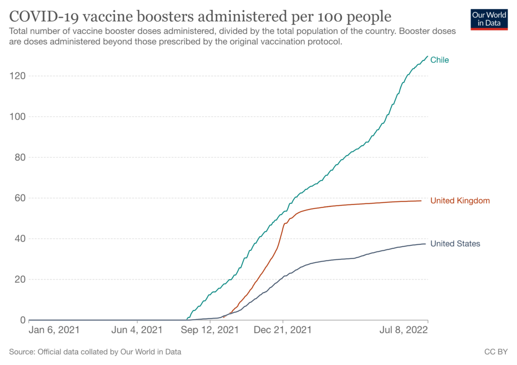 At the present time, more than 90% of Chileans are double-vaccinated – almost 20 percentage points higher than in Britain. Chile has also administered a greater number of ‘booster’ doses. By December 14th, over half the population had received one, compared to just 19% of Americans.