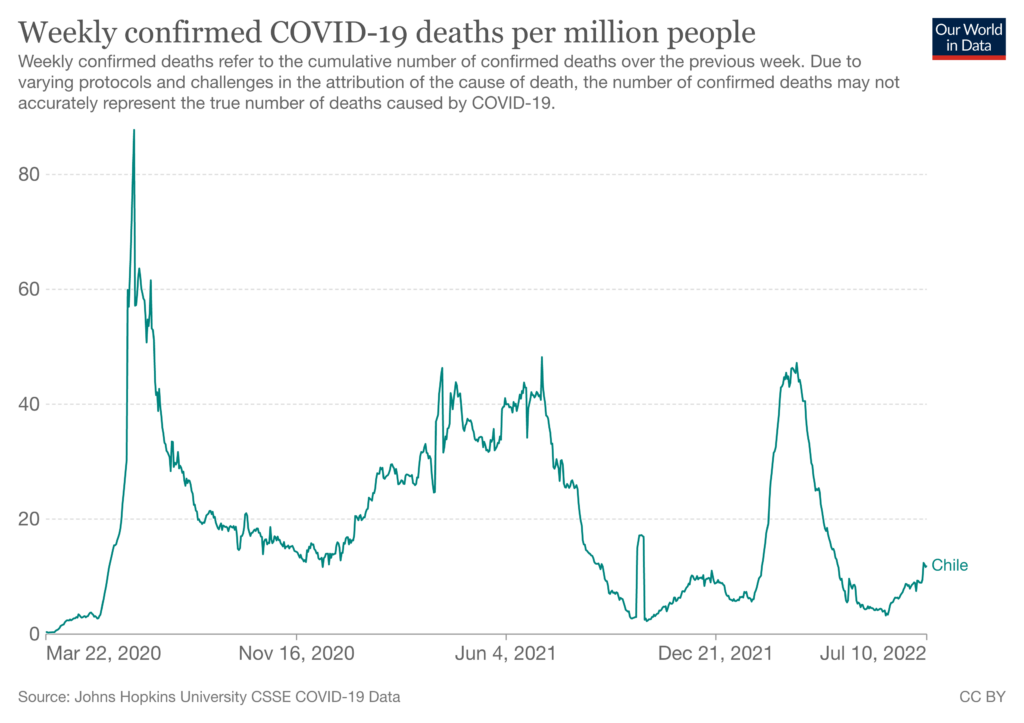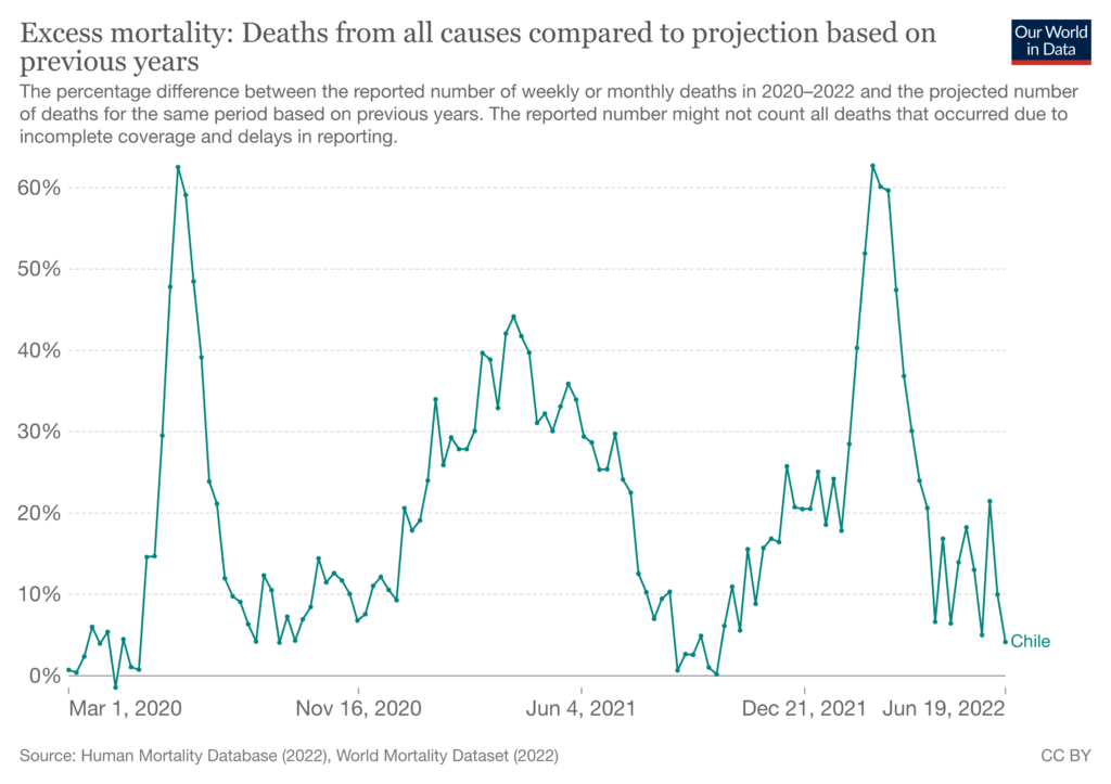 As in many other countries, Chile saw a major post-vaccination wave, which burgeoned in January of 2022. By this time, 86% of the population were double-vaccinated and 57% were ‘boosted’. Despite this, excess mortality peaked at 63%, and was actually greater than in the country’s first wave.