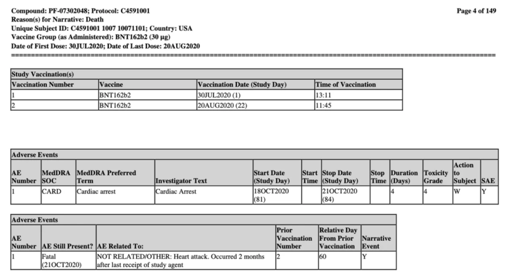 One of the deceased participants, a 56-year-old woman known as subject #10071101, was given two doses of the vaccine on July 30th and August 20th 2020 and died from a cardiac arrest two months later. In Pfizer’s report on the participant it says: