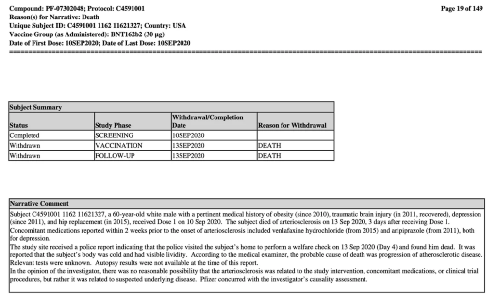 A second deceased participant was a 60 year-old man known as subject #11621327, who died three days after his first dose of vaccine, given on September 10th 2020. The report says that the “probable cause of death was progression of atherosclerotic disease”. However, the subject had no known history of the condition (though was reported as obese). While the investigator deemed there to be “no reasonable possibility” of a link with the vaccine, seeing that it happened three days after the injection and “autopsy results were not available at the time” of the report, again, it’s hard to see what that conclusion is based on.