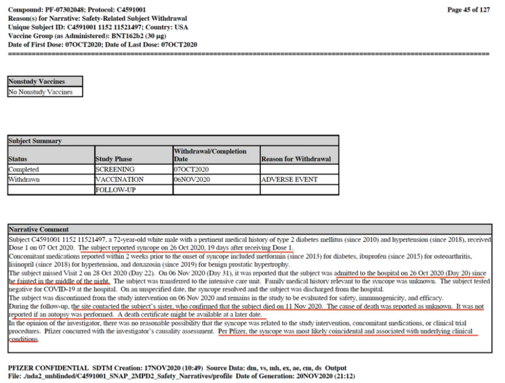 A third deceased participant was a 72 year-old man known as subject #11521497, who received the first vaccine dose on October 7th and 19 days later, on October 26th, was admitted to hospital because “he fainted in the middle of the night”. Reported as a syncope (temporary loss of consciousness usually related to insufficient blood flow to the brain), 16 days later, on November 11th, he died. The investigator claimed there was “no reasonable possibility that the syncope was related to the study intervention” and Pfizer said the syncope was “most likely coincidental”. But again, it’s unclear what this assessment is based on as the cause of death was reported as “unknown” and neither the investigator nor Pfizer attempted to investigate.