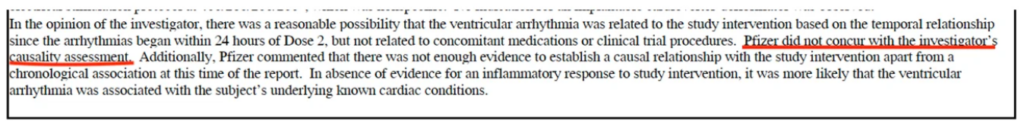For example, a 71-year-old woman known as subject #11421247 developed severe ventricular arrhythmias in the evening following her second dose on October 14th 2020. The trial investigator wrote that “there was reasonable possibility that the ventricular arrhythmia was related to the study intervention [vaccine]”. However, Pfizer stated there was “not enough evidence to establish causal relationship”. This was despite arrhythmia being one of the adverse events of special interest (AESI) listed by Pfizer in its analysis of post-authorisation adverse event reports.