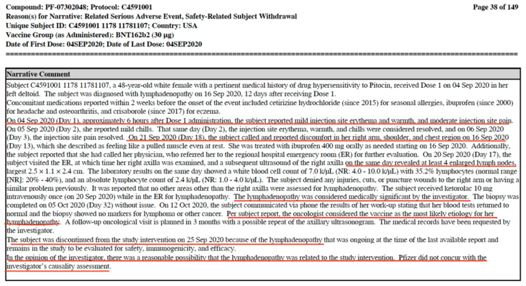 Another example is a 48 year-old woman known as subject #11781107, who developed lymphadenopathy with “at least four enlarged lymph nodes” in the period immediately after receiving her first (and only, as she withdrew owing to the adverse event) dose of the vaccine. The hospital oncologist stated the vaccine was the “most likely etiology [cause] for her lymphadenopathy” and the trial investigator said “there was a reasonable possibility that the lymphadenopathy was related to the study intervention”. However, once again, “Pfizer did not concur”.