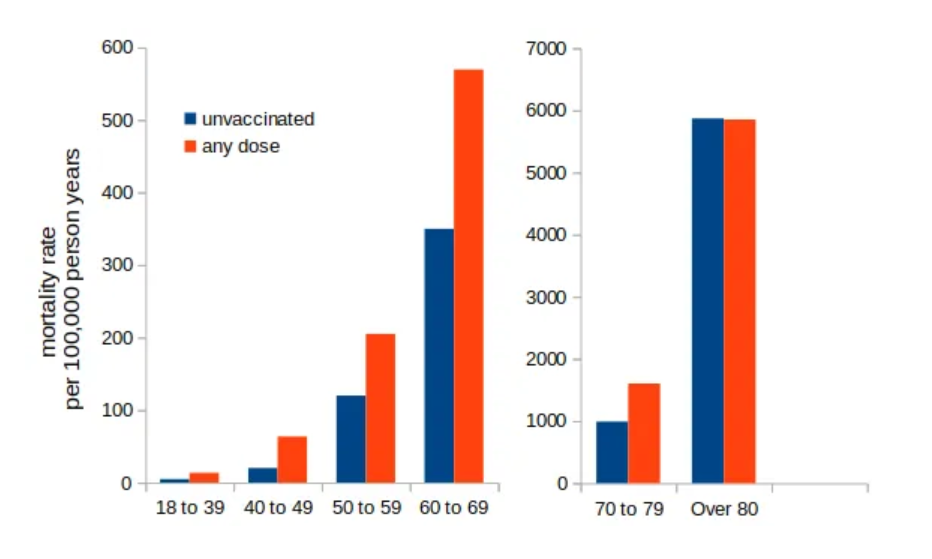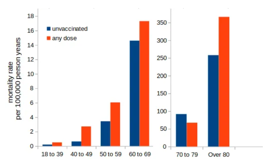 Now we see a completely different picture. The vaccines appear to increase the risk of death from Covid for all age ranges other than 70-79.