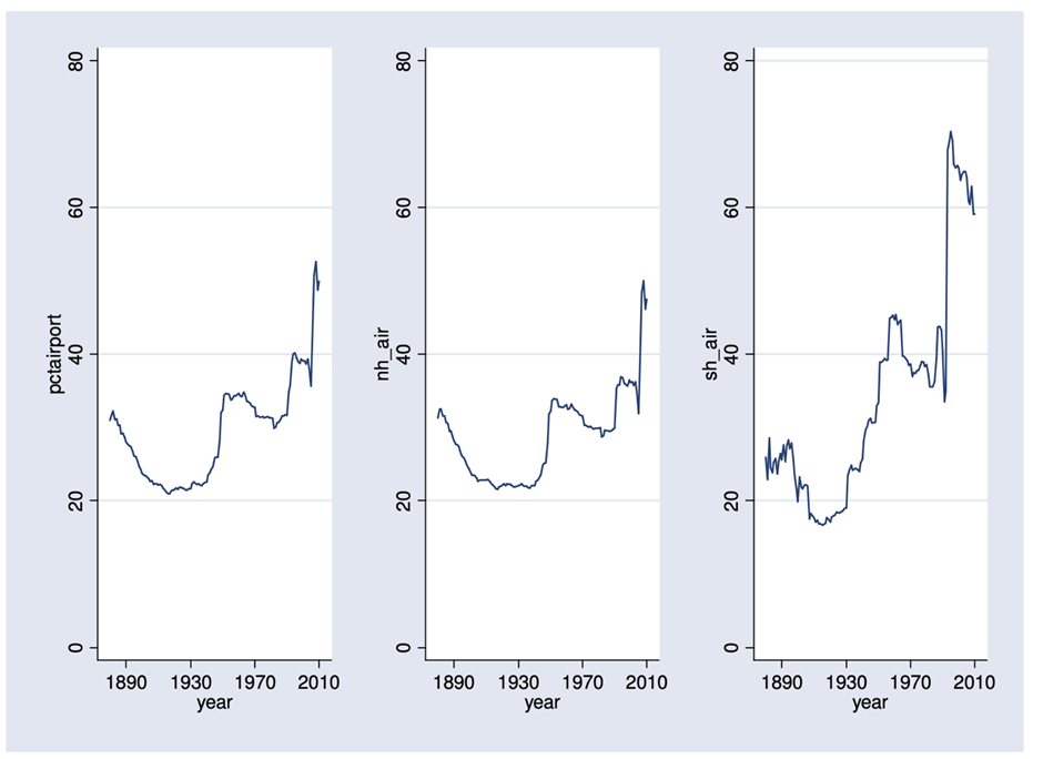 The above graph is given by Professor McKitrick to show the percentage of data supplied by airport sites to GHCN from 1890 to 2010. The graph on the left is the global percentage with the northern hemisphere in the middle and the southern on the right. The data going back to 1890 presumably refer to sites that became airports. For instance, Chicago’s O’Hare Airport was an orchard field with a measuring thermometer in the late 1800s and retains the ORD code to this day. The large jump after 1990 is clearly visible in all three graphs.
