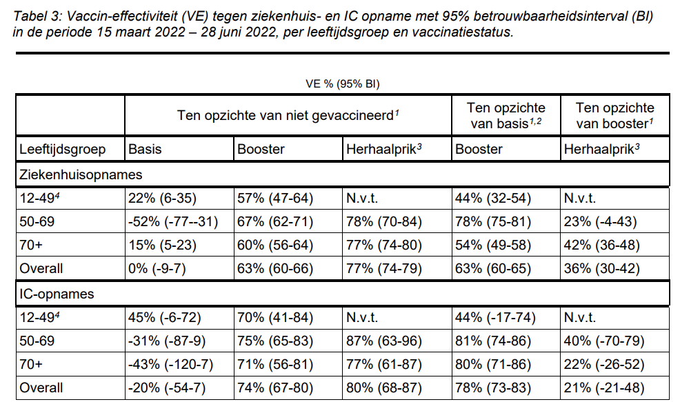 Using hospitalisation figures from March 15th to June 28th 2022, the report finds that overall vaccine effectiveness against hospitalisation from two doses was 0%. Broken down by age, it was 22% for 12-49 year-olds, minus-52% for 50-69 year-olds and 15% for the over-70s. Vaccine effectiveness against ICU admission was minus-20% overall, breaking down to 45% for 12-49 year olds, minus-31% for 50-69 year-olds and minus-43% for over-70s. These figures are shown in the table below, along with confidence intervals and figures for the booster and ‘repeat shot’ (herhaalprik). (Translations: basis means the basic course i.e., two doses; ziekenhuisopnames is hospital admissions; IC-opnames is ICU admissions; ten opzichte van niet gevaccineerd means relative to unvaccinated.)