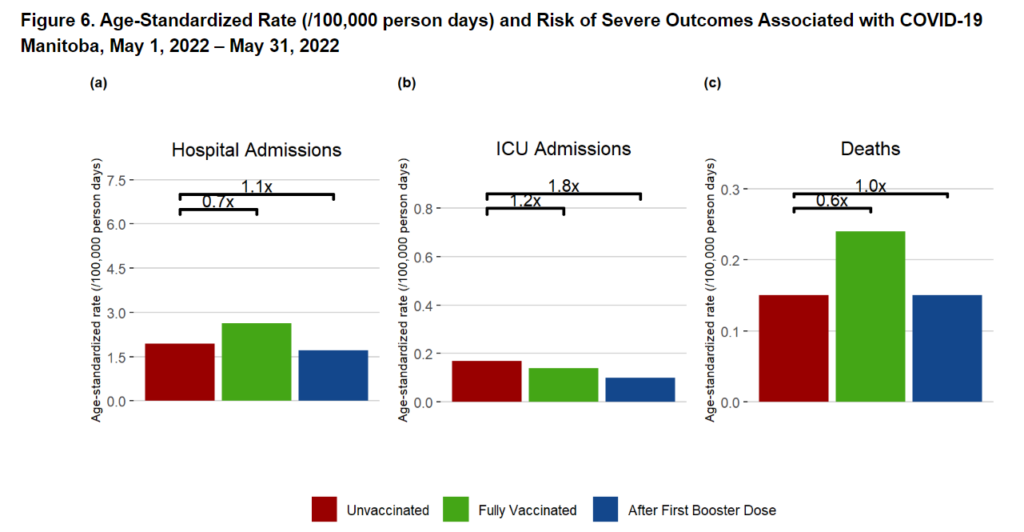 The latest data from Canada also show negative vaccine effectiveness against serious disease and, in this case, death. Figures from Manitoba for May (highlighted by Alex Berenson) show hospital admission, ICU admission and death rates by vaccination status, adjusted for population size and age (see below). These show that the double-dosed are more likely to be hospitalised and die with Covid than the unvaccinated, and that the boosted have basically the same risk of these things as the unvaccinated. We should note that the triple-dosed count as double-dosed until 14 days after their booster, meaning any Covid deaths in the 14 days after a booster will end up in the double-dosed category.