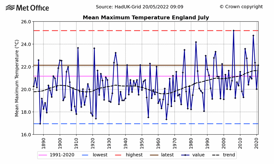 Mean Maximum Temperature England July trend line shows almost a straight line increase from 19.5 in 1960 to 21.5 in 2020. It does indeed look a bit like Thermageddon, doesn’t it?