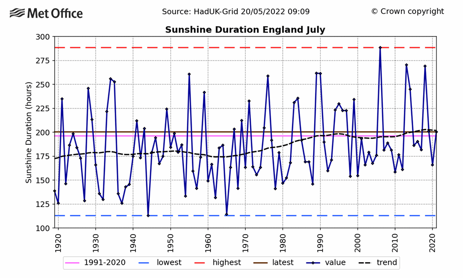Now let’s take a look at the days of sunshine recorded in July. This is relevant since the sun is generally at its hottest when it is unobscured by clouds. There have been a few more hours of sunshine of late, but the record going back to the 1920s shows that the current amounts we see were not uncommon at that time. And again we can see that a trend towards slightly higher amounts started in the late 1960s, when the Earth was cooling slightly and carbon dioxide levels were lower. If the current heatwave is caused by climate change, how do we explain the glorious summer of 1976?