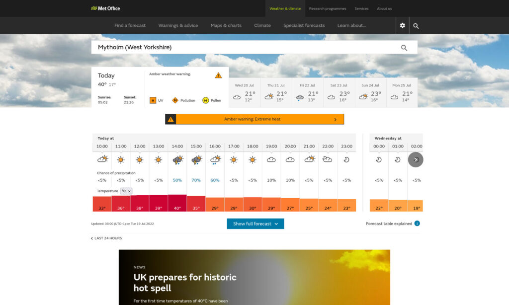 - “Letchworth Garden City, Herts. Forecast high of 39C. Actual reading: Peaked at 35.6C.”