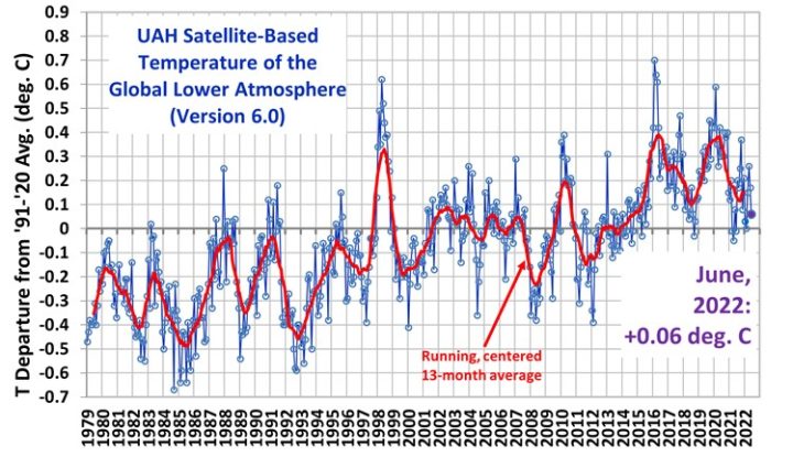 Stop Press: A temperature of 40.2°C has been recorded, the first above 40° for the U.K. It was, of course, at Heathrow airport, where tarmac and jet engines raise the temperature above the surrounding areas. A reader near Heathrow says his thermometer only hit 39°C today maximum. The new national record is 40.3°C, measured at 5pm at RAF Coningsby – another airport. It was certainly a hot one today, particularly in certain areas (and airports), but once again the forecasts were way high. 43°C was forecast, 3° above the actual maximum. This is even further out than yesterday, where a forecast of 40°C was missed by almost 2°. In Warwickshire, my phone app read 39° in the middle of the afternoon but never hit 40°. The cause of the unusual heat is not related to climate change, of course – it is a freak weather phenomenon linked to the June heatwave in Europe. To quote Wikipedia: “The June heat wave was due to an interaction between the high pressures that generate atmospheric stability and Storm Alex, the strong sunshine of the boreal summer, and an air mass coming from North Africa, which entered the Iberian Peninsula loaded with suspended dust (that caused haze in the center and south of the peninsula).” The Wikipedia page about the U.K. heatwave omits this information for some reason, but does include a little section about the “misinformation” that this heatwave is not caused by climate change. The global temperature in June was no higher than normal, despite the European heatwave.
