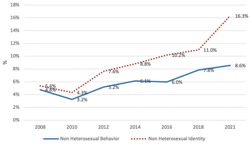Unsurprisingly, the rise in LGBT identity is concentrated among young people. Depending on which dataset you look at, between 16 and 25% of under 30s now identify as something other than ‘heterosexual’. The true figure is likely toward the lower end of these estimates, says Kaufmann. Even so, this would still mean that one in every six young Americans has an LGBT identity.