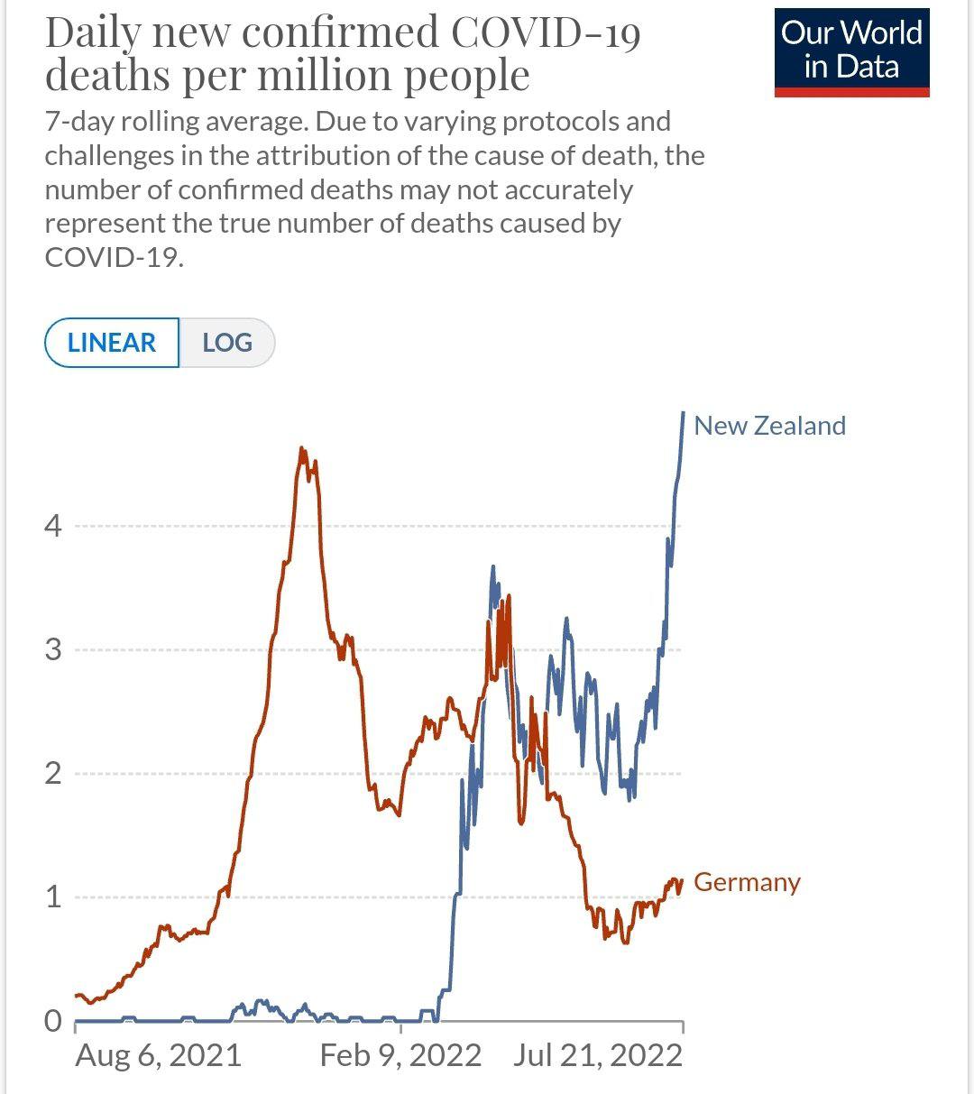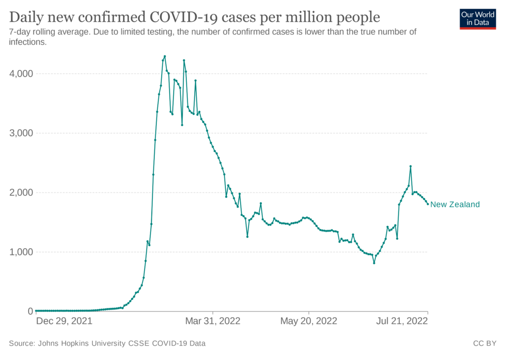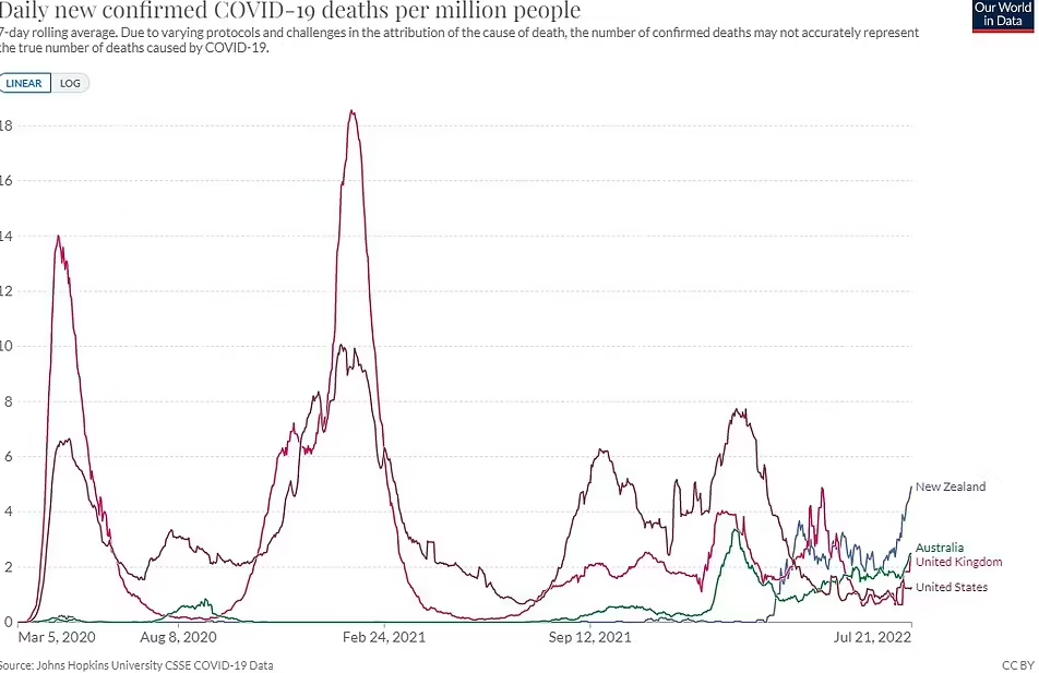 Data from Oxford University-backed research platform Our World in Data show five people per million in New Zealand were dying with Covid every day in the week to July 21st — up by a third from the previous high of 3.68 in March.