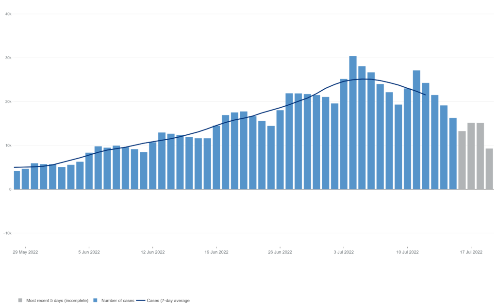 “Other sources have suggested that for England the number of new infections peaked around the July 8th to 10th and are now in decline.