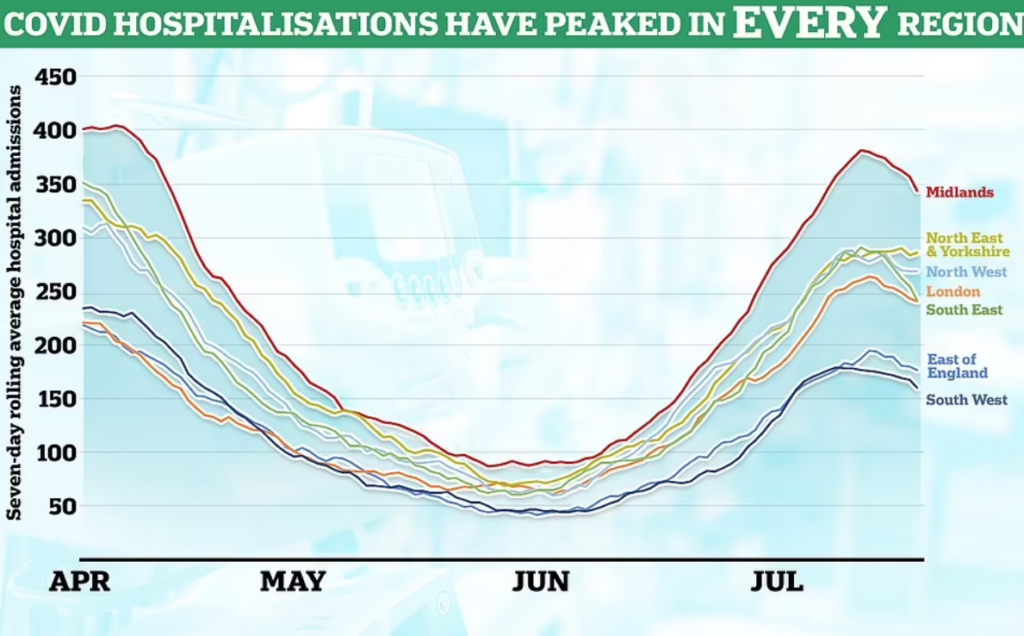 “The suggestion new infections are indeed now falling is further supported by the fact new hospital admissions are also now falling, though I suspect the next couple of days’ data may be confused by increased hospitalisations because of the heat wave.”