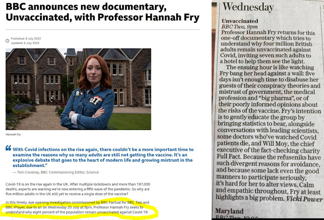 Just more evidence of why the BBC is now perhaps the biggest threat to the UK. It’s unique position to influence the culture impacts every decision made from Government through to the public. Interesting statistics about how many people haven’t had the shot. I hear rumours that they’re going to come after unvaccinated people in a big way from September onwards, so this is presumably the advance guard.