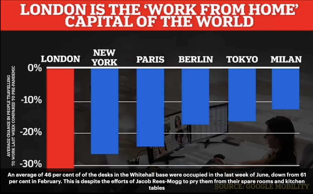 The Telegraph reports the latest data on office occupancy reveals that almost every department has brought more staff back to the workplace since Rees-Mogg’s crackdown.
