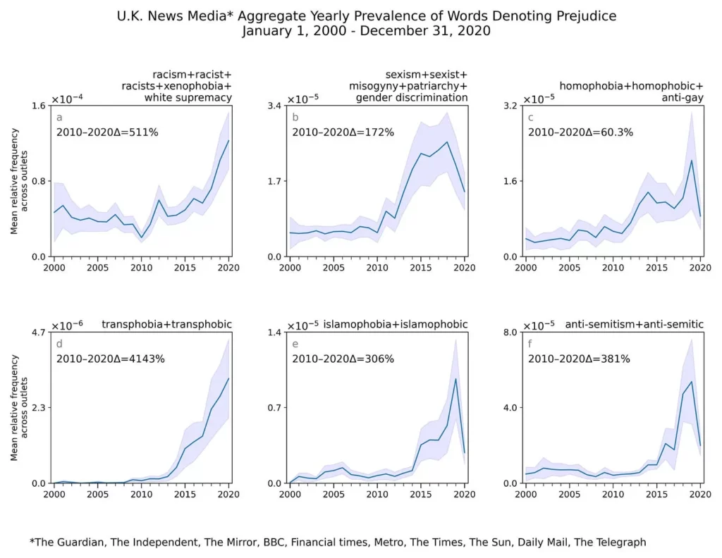 Earlier today, Noah Carl wrote about Spain’s Great Awokening, citing the work of David Rozado who looks at the increasing frequency with which particular words and phrases appear in the mainstream media, such as ‘transphobia’ and ‘white supremacy’, indicating an embrace of woke ideology. The same researcher has now collaborated with the political scientist Matthew Goodwin to look at the British media. Unsurprisingly, the results show it has succumbed to the same intellectual virus. Here is an extract from Matthew’s Substack newsletter outlining their findings.