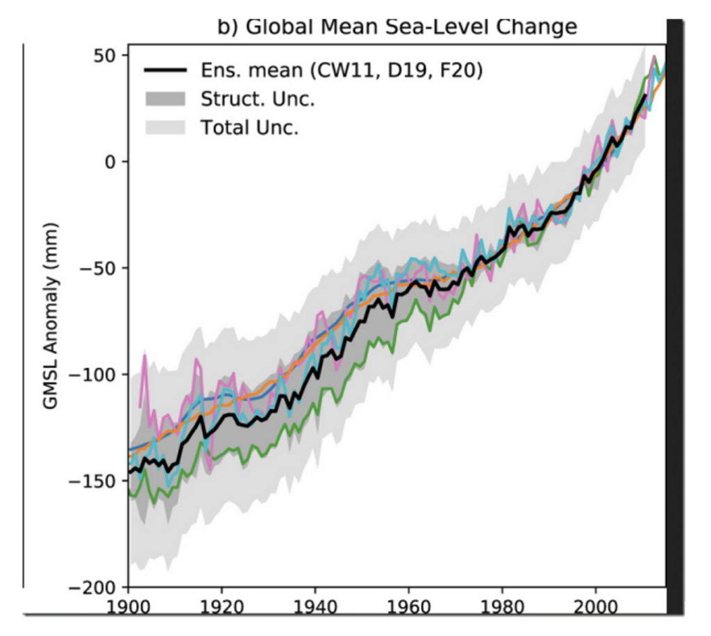 The Met Office notes that since the 1900s, sea levels have risen around the U.K. by between 12-21cms, and this compared with the 15-25cms likely range of global sea level rises. A reader of Homewood’s blog sought further details from the Met Office and was told that according to the “scientific consensus” contained in the IPCC Sixth Assessment Report, the average annual global sea level rise was 1.3mm between 1901 and 1971. This increased to 1.9mm between 1971 and 2006, and further increased to 3.7mm between 2006 and 2018. On the back of the figures as presented, it was claimed that human influence was “very likely the main driver of these increases since at least 1971”.