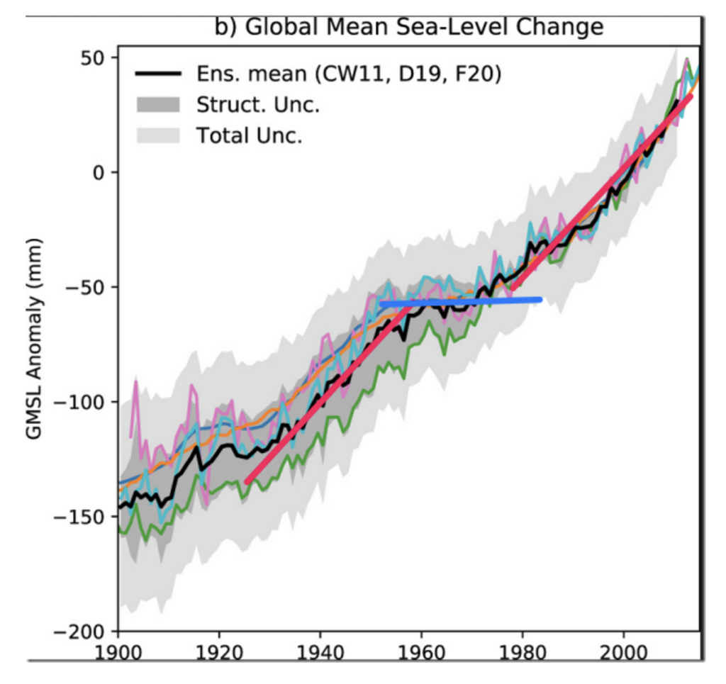 The substantial pause up to the 1970s is clearly seen, and this has been added to the 1901-1970 average. The two red lines shown seem to show that the recent increase in sea levels is similar to that experienced prior to the slow-down in the earlier part of the last century.