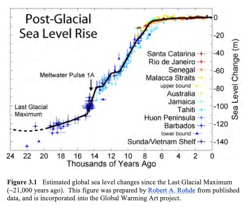 As the last ice age released its grip, sea levels rose by over 120 metres. On the scale of measurement needed to show this dramatic melt, the change over the last few thousand years appears as an almost straight line. It can be argued that the last time rising sea levels were a major threat to humanity was around 8,000 years ago.