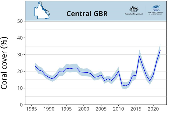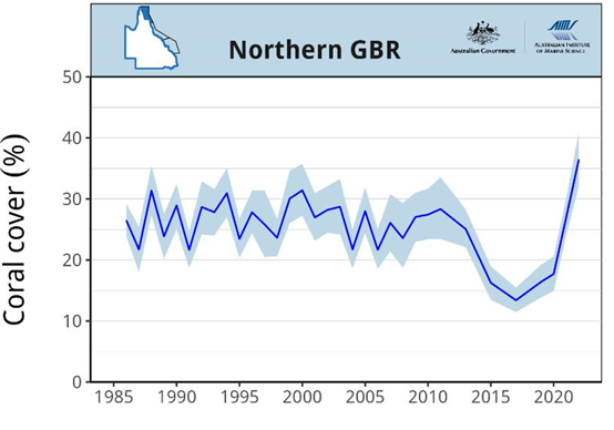 The near vertiginous rise in the annual growth of coral at the Great Barrier Reef (GBR) is continuing, with further major increases recorded across large areas. According to the 2021-22 annual summary from the Australian Institute of Marine Science (AIMS), levels of coral cover in the northern and central areas of the reef were at their highest levels over the past 36 years of monitoring.