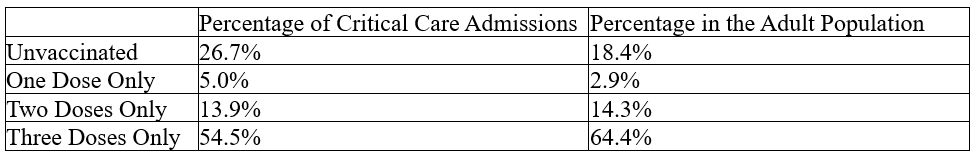 These data are consistent with recent reports from the Netherlands and Canada and with U.K. data on real-world effectiveness against death. They are also broadly consistent with data from ICNARC on intensive care admissions with COVID-19, once adjusted for the estimate of the unvaccinated in England (ICNARC uses the ONS population estimates in its own tables and graphs, resulting in an overestimation of the ICU admission rate for the unvaccinated). For the most recent data, February 2022, it shows the following admission statistics: