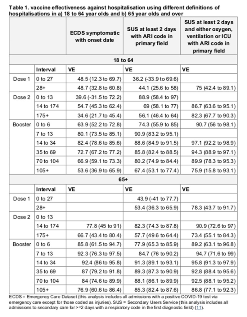 The UKHSA Vaccine Surveillance Report includes four pages on these vaccine surveillance data. It also includes 12 pages on reporting on the various estimates of vaccine effectiveness that have come from scientific studies. Of particular note is the estimate of vaccine effectiveness against hospitalisation with severe Covid.