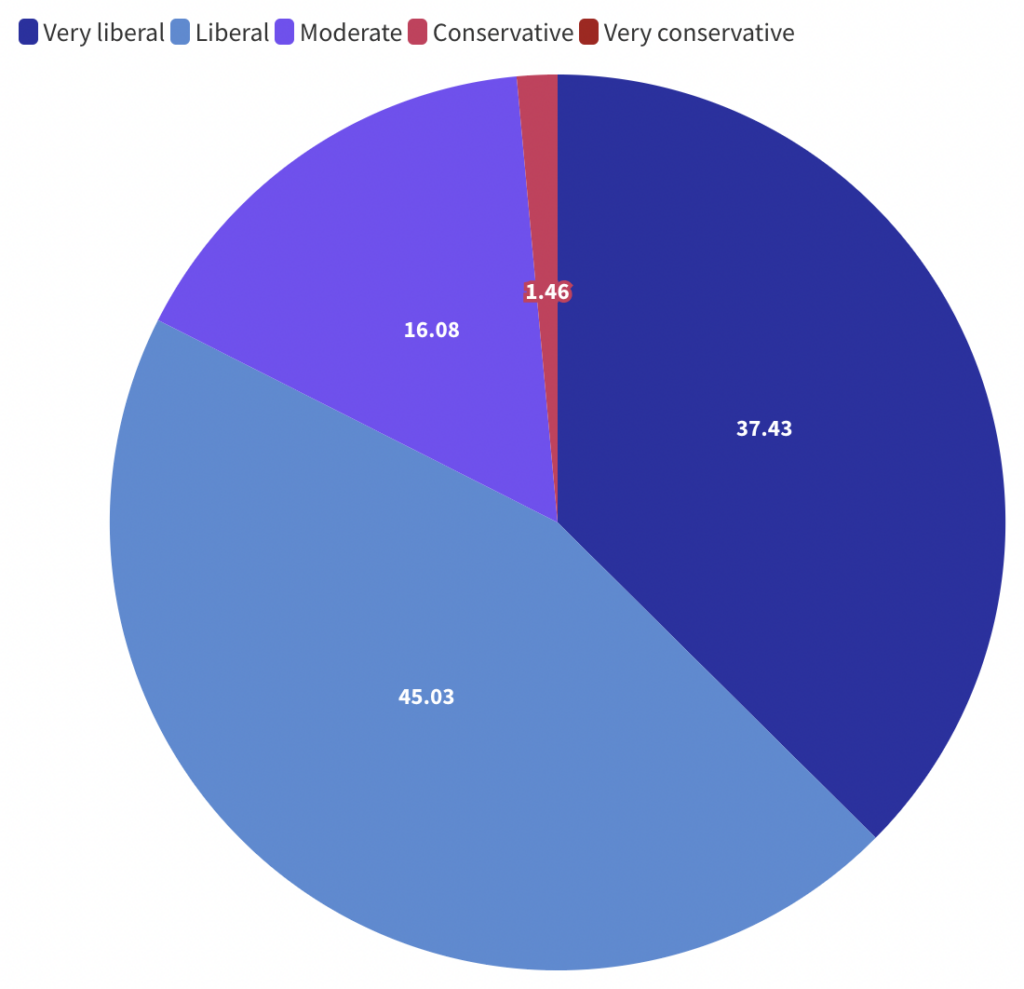 82% of respondents said “liberal” or “very liberal” (which in the US means “left-wing”). An additional 16% said “moderate”. Only 1.5% said “conservative”. And not a single respondent said “very conservative”. This means that conservative faculty at Harvard are outnumbered by roughly 55 to 1.