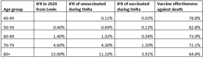 By dividing the IFR in the vaccinated by the IFR in the unvaccinated we can get an estimate of real-world vaccine effectiveness against death during the Delta wave, which is 79% for those in their 40s, 83% for those in their 50s, 74% for those in their 60s, 72% for those in their 70s and 65% for those over 80. These figures are summarised in the table below.