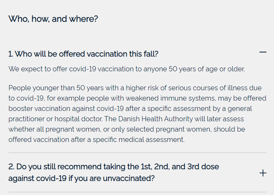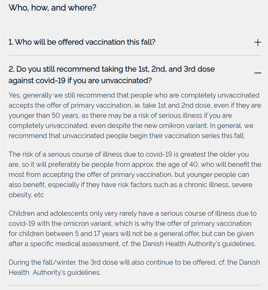 Denmark’s policy towards vaccination in the autumn of 2022 will focus on the over-50s. The under-50s will only get a booster if a doctor recommends it. With respect to pregnant women getting vaccinated a decision has yet to be made. The policy is available in English here; below I have printed some selected highlights.