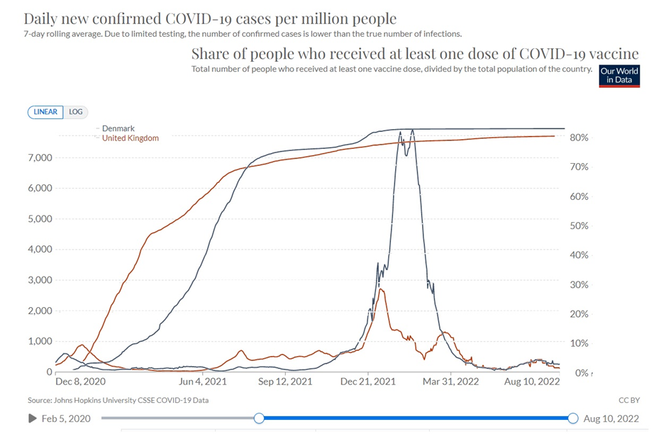 It is perhaps worth just looking at the Danish experience of Covid since the vaccination programme started back in December 2020. Figure 1 plots the reported infection rate in Denmark and the U.K. on the left hand axis and shows vaccination take-up on the right hand axis. Having had one of the lowest rates of infection right through 2020, post vaccination Denmark’s reported infection rate peaked at 2.5 times the U.K. rate during the early months of 2022 despite 85% of the population being vaccinated. The Danes appear to have adopted a pragmatic approach in the face of the vaccination’s failure to prevent infection and transmission.