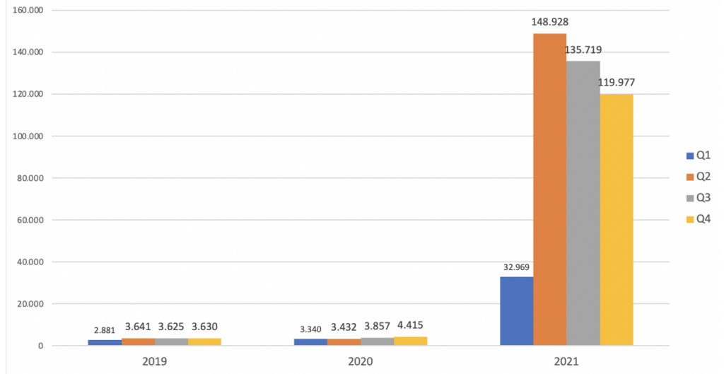 In 2019, the total number of confirmed diagnoses was 13,777. In 2020 it was 15,044. In 2021 the total number was 437,593. This is more than thirty-fold the average for those four codes in 2019-2020, a 2,937% increase.