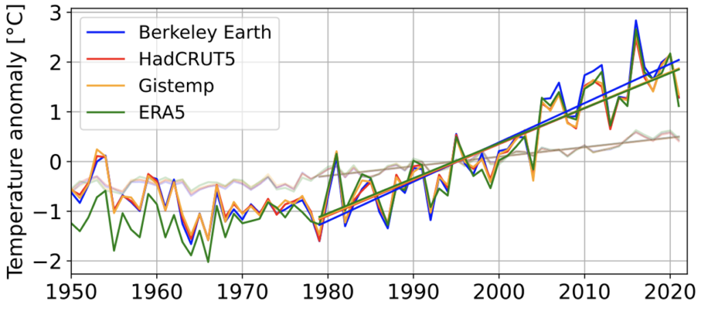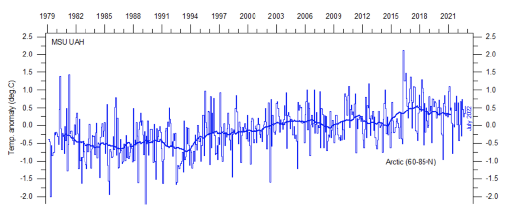 Above are the databases and graphic results used in the ‘four times’ calculation. Curiously there is no place for the accurate satellite record produced by the University of Alabama in Huntsville (UAH), despite the satellite record also starting in 1979. ERA5 is a climate model. The other three are surface datasets, which as we have shown are subject to frequent, back-dated upwards temperature adjustments. Surface measurements across the Arctic are patchy in many areas, since sea ice is not a stable base for permanent devises. Weather satellites provide an almost complete coverage of the globe.