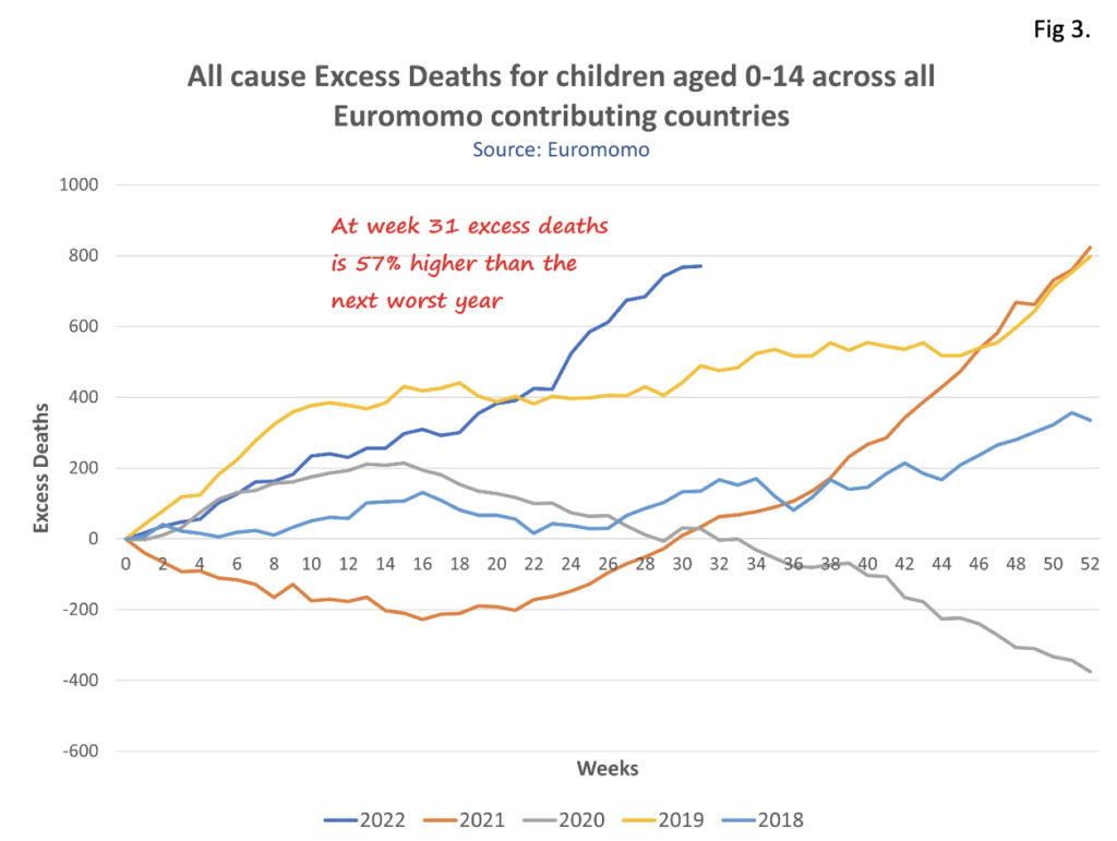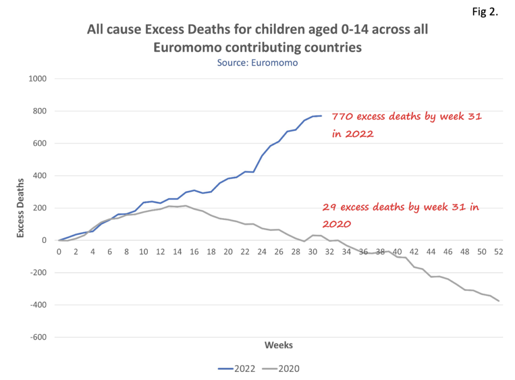 Having given you the trigger warning, Fig 2 shows the Euromomo data for 0-14 year-olds for just 2020 and 2022 in comparison to the ‘baseline’ of expected deaths. To be clear, this data is for all contributing Euromomo countries which include the U.K.