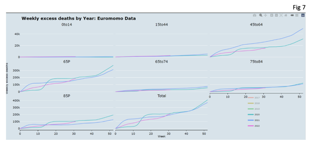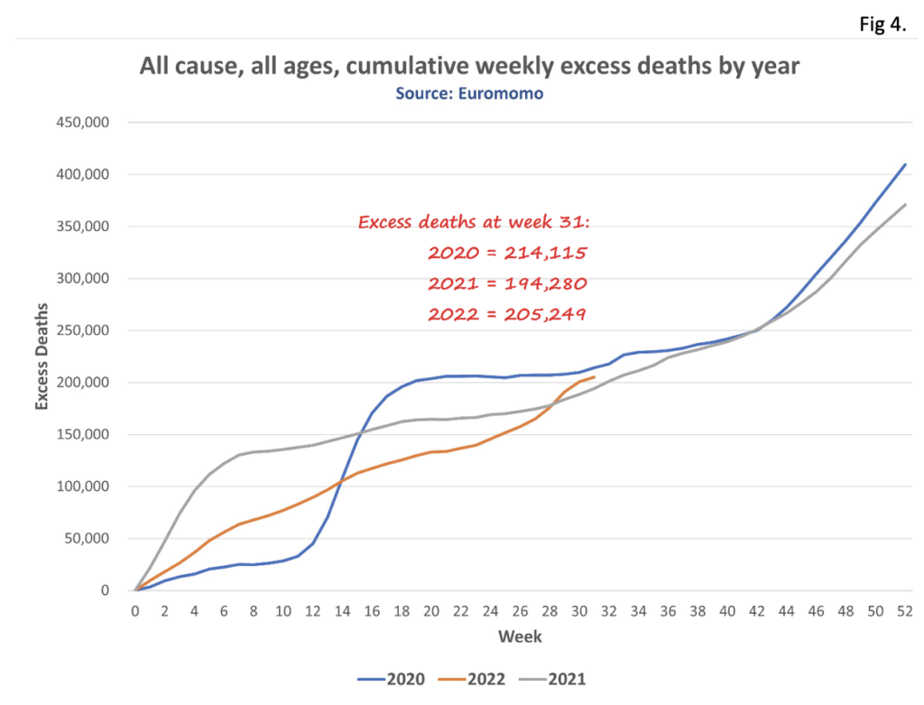 Let’s return to the Euromomo data. In 2020 as at August 11th there were 214,115 all-age excess deaths. To August 11th 2021, there were 194,280, a 9% reduction on 2020. Yet in 2022 by August 11th it had reached 205,249, an increase of 6% on 2021, almost on a par with 2020.