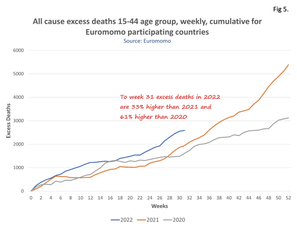 If we look at excess deaths of people aged between 15 and 44 (see Fig 5), we see that excess all-cause mortality is 61% higher in 2022 than in 2020.