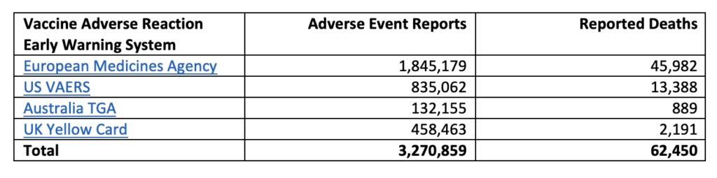 Associate Professor Christopher Neil MBBS, FRACP, PhD, the Incoming President of the Australian Medical Professionals Society, has written an open letter about this, citing the rule-of-thumb yardstick that these early warning system only catch about 10% of all adverse events. Still, the results as they stand – 3,270,859 adverse events and 62,450 reported deaths, all with full contact details, descriptions of the events, information on the patient/victim’s doctor – would certainly give even the most tardy of investigators a good head start. What’s the point of an early warning system if no one heeds its warnings?