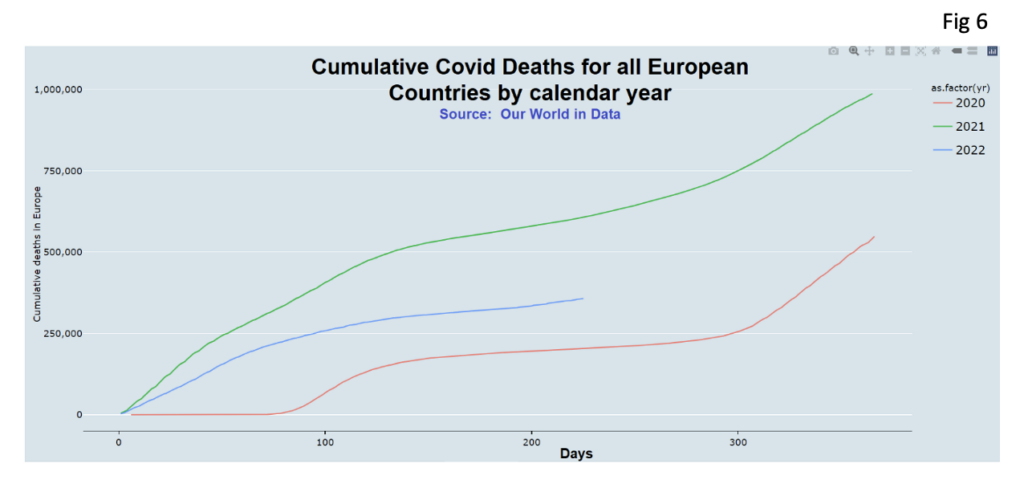 Another odd thing I’ve only recently noticed is that cumulative Covid deaths across Europe according to Our World in Data are higher in 2022 year to date than they were at this stage in 2020. How can that be? I don’t want to labour the point, but Omicron is more benign, there’s loads of natural immunity and 90% of the population has been vaccinated. What’s going on? How come it was a disaster in 2020 and now, in 2022, apparently more people are dying and no one mentions it? Figure 6 shows cumulative deaths across all European countries from January 1st of each year onwards. See if you can spot when those 90% efficacious vaccines kicked in? Someone may point out that deaths in 2020 didn’t kick-in until March/April, some three or four months into the year. Well, deaths in 2020 from Covid didn’t reach the cumulative total we’ve reached already in August until late November, over three months from now.