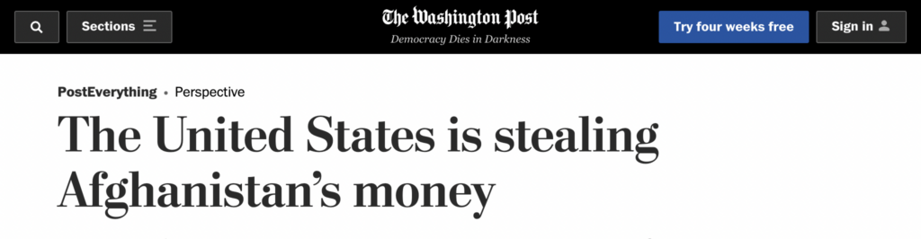 There’s a technical term for this: stealing. As political scientist Daniel Drezner argues, “no matter what legal rationale is being provided, the federal government is stealing Afghanistan’s money”.