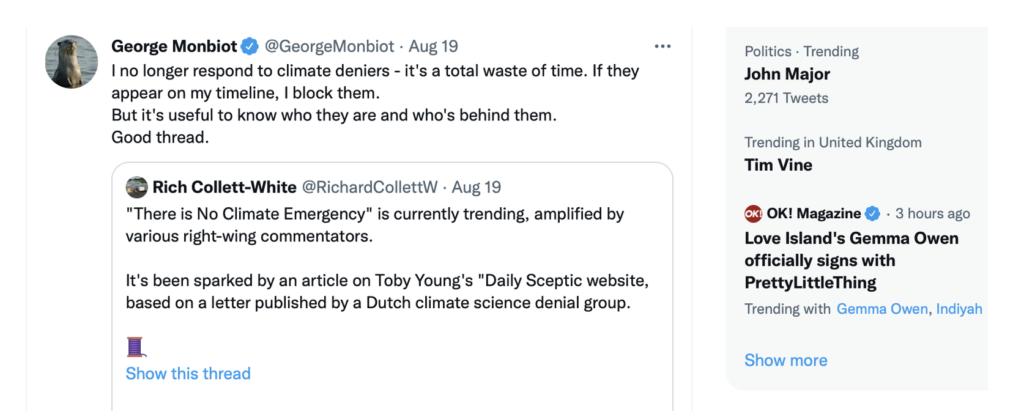 Monbiot is a particularly vile element of the climate cultists. A useful idiot with typical extreme Marxist viewpoints garnered from his middle class roots in student activism; caviar Marxist.