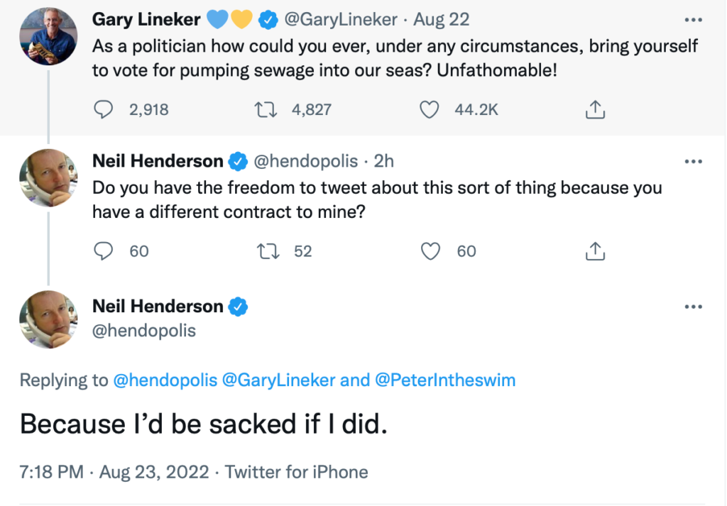 In a series of now-deleted tweets Henderson responded directly to Lineker’s tweet, which criticised Conservative MPs who voted against imposing a legal duty on water companies to reduce sewage discharges.